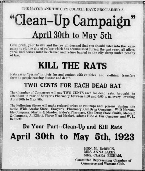 “Boys, they are worth two cents apiece, provided you deliver ’em dead, anytime on or between April 30 and May 5. We mean rats – one of the biggest pests civilization has to contend with. Take your “catch” to the Camber of Commerce and count ’em up and the money will be ready for you.