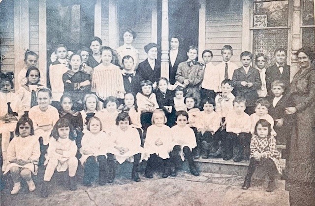 Pictured are: (Top row from left) Genevieve Bloker, Unknown, Clement Nanson, Flora Hart, and Miss Ethel Moore. Third row from left are: Faye Moad, Freddie McCoy, Antoinette Aquino, Joyce Huffman, Byron Tinsley, and Miss Raye Nevil (Left of porch post) Miss Nell Collins (right of post) Joe Nanson, Cleo McCoy, Julian Jumper, Charlie Knoerr, unknown, and Byron McKay. Second row, from left are :Marguerite Bloker, Frances Aquino, Ruth Crow, Unknown, Conchita Farqua, Marian Musgrave, Frances Mehrle, Mary Mehrle, Mary Shade, Paul Mehrle, Robert Mehrle, Robert Johnson, William Johnson, Byron Ward, and Mrs. C. Mehrle. Front row from left are: Mary Frances Hillard, Janice Burgess, Mary Nanson, Alberta Knoerr, Mary Watkins, Bill Collins, and Anna G. Rayburn.