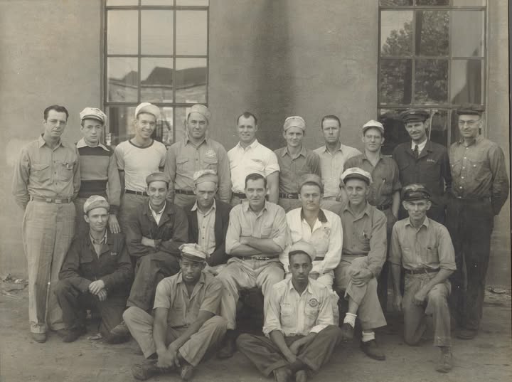 Pictured here is the original crew: H. N. (John) Arnold, Guy Hustedde, and Ralph Hepler, who managed the repair department; Lum Pendergrass, parts man, R. J. King, bookkeeper, Lester Cottrell, C. H. Sawyer, C. E. Murphy, A.L. Allen, Owen Thompson, J.M. Nicholson, James Earls, W. L. Turner, D.A. Davis, and Tommie Wells.
