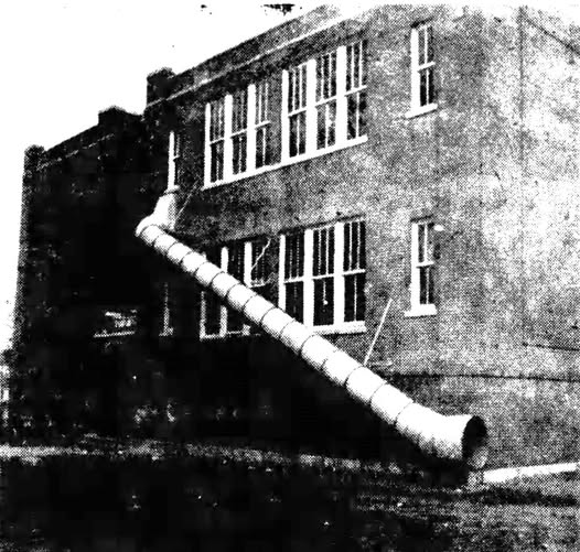 #tbt In February of 1951, it was reported that a new type of fire escape was installed at the older of the two elementary schools. This building – Lee Rood – was frowned upon by the State for years because of its age and the hazards to the lives of the children which it posed.