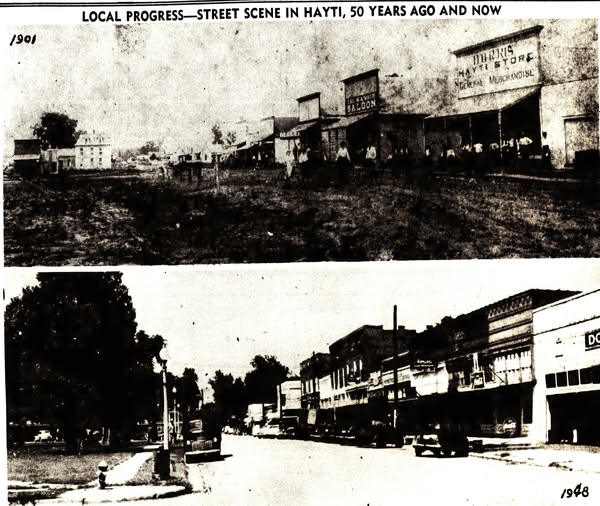 #tbt Hayti is depicted in two identical shots almost 50 years apart, showing how Fourth Street looked facing north, from a point approximately in front of the Masonic Building on the southwest corner of Fourth and Broadway in 1901. The two story building on the left in the second block was the Commercial Hotel, which was situated on the site that later housed Shirey’s IGA. The second photo is as the same street looked on the August 20, 1948 issue of the newspaper.