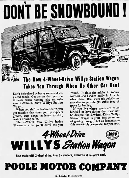 #tbt We might have been able to use a few Willys Station Wagons around here this week. From January of 1950, this ad for Poole Motor Company in Steele describes this unusual car made at that time by the Jeep Motor Company.