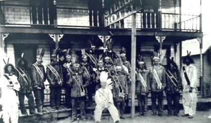 #tbt From the book “Pemiscot County: a Pictorial History” comes this photo of the “Braggadocio Redmen” in front of the Steele Hotel, about 1907 or 1908. At left is Arch Huckaba from Braggadocio, in the white suit; second row (behind the seated chief) at left is Theo Klinkhardt of Hayti; in the back row, left side of the porch post is Herb Gallaher. Directly in front of Herb is Amos Gallaher of Braggadocio. All other men, unfortunately are unknown, as is the purpose of the Braggadocio Redmen group. Nothing was published in the newspapers of that time, which leads to the thought that this was a secret society of that historical period.