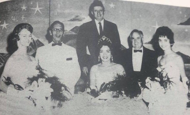 In 1961, the winners were (seated, center) Queen Miss Donna McGimpsey of Caruthersville, (at left) Miss Sherry Gill, Hayti, first alternate and (at right) Miss Ginger Hardy, Caruthersville, second alternate. To the rear of the ladies are (from left) “Kuz” Moreland of radio station KCRV, Legion Post 88 Commander, M. J. “Junior” Upchurch, and W.W. “Burley” Chism, announcer for the event.