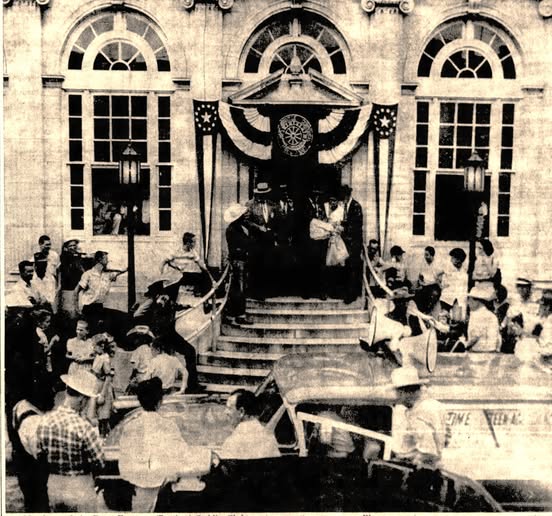 #tbt At the Hayti city election in 1952, Martha’s Beauty Salon at 406 E. Washington was one of the polling locations. Precinct judges were Robert Garrett, Mrs. Russell Dalton, and Mrs. Ollie Chism. Shown here are people handing out cards to voters around noon in front of the precinct.