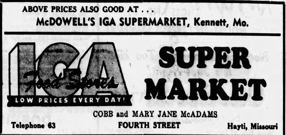 Also shown is a 1950-era picture of the IGA in Hayti with one of the newspaper ads for the store.