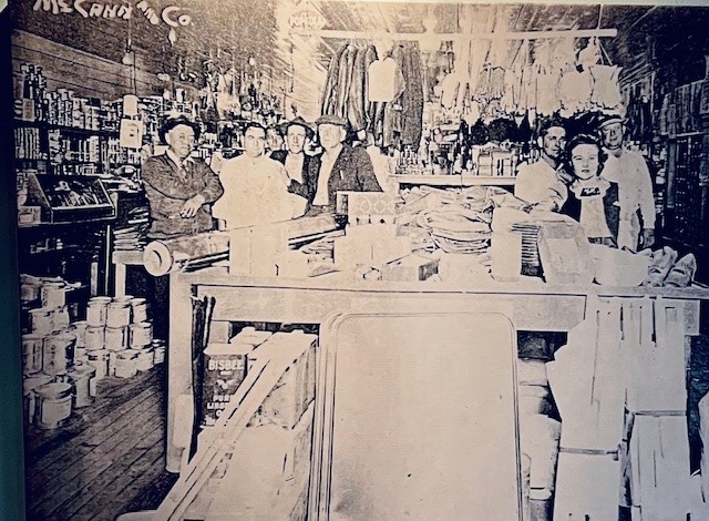 Shown in this picture at McCann and Co. are Elvis McCann, Opal McCann (the postmistress), along with other business people and customers at the counter, showing many of the items that were for sale in the store. Mrs. Margaret “Pog” Childers, who provided the information for this photo, said that her father, Elvis McCann, died when she was only three years old and that she grew up in the post office here as her mother did her work.
